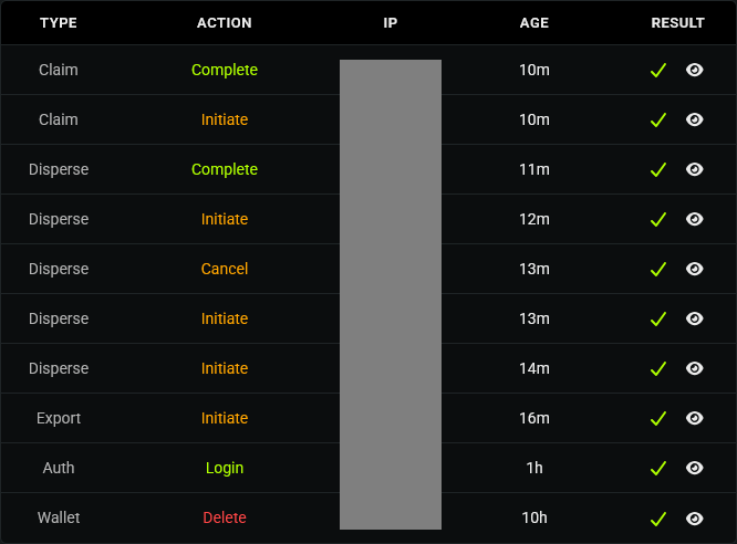 - Type - Category of action (e.g., Auth, Wallet, Export).