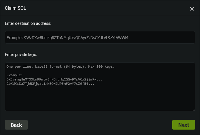 - Paste private keys manually to sweep SOL into a chosen destination.