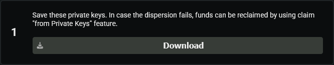 Simple/Hard: Do not proceed with dispersion unless you have saved the generated keys. Without them, you cannot access the generated wallets - and if dispersion fails, funds may be lost permanently.
