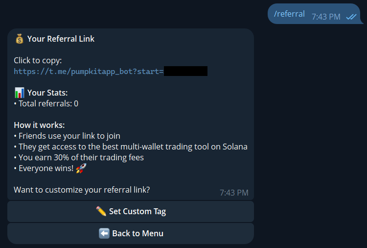 Share your referral link (found in the PumpKit Telegram Bot). If a new user clicks your link and DMs the PumpKit Bot (Start), and they haven’t been referred by anyone else before - you get the referral.