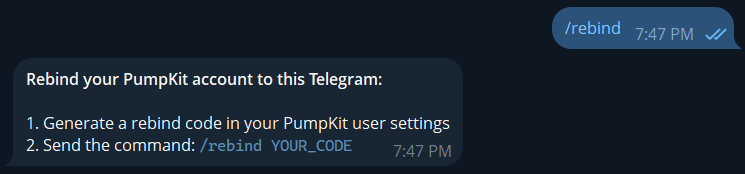 - Use the /rebind command in the PumpKit Telegram Bot.