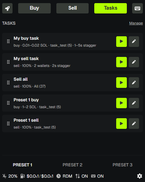 Tasks let you define reusable buy, sell, or Global Fee actions with specific wallet selection, amount or fee budget settings, and optional stagger intervals. Run a task with one click instead of configuring each trade manually. Tasks are ideal for repeated workflows like "Quick buy 0.1–0.5 SOL on All wallets", "Sell 50% from Sniper preset with 2s stagger", or a Global Fee run with a shared priority fee budget.
