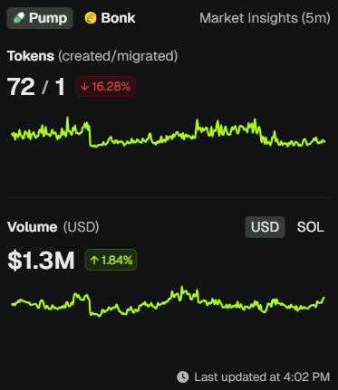 View 5-minute volume for Pump.fun and Bonk.fun. Gauge platform activity and time your launches.