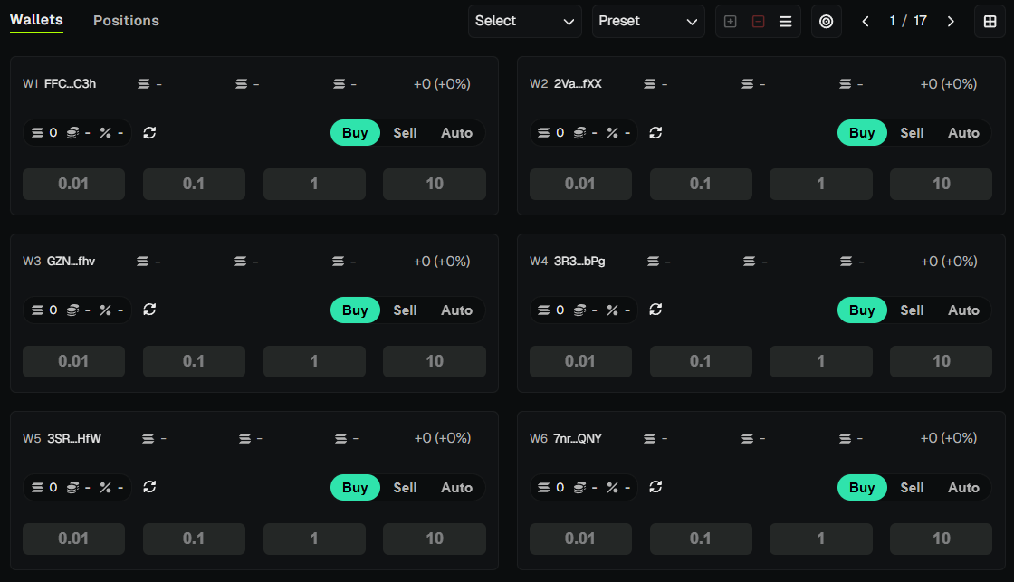 Monitor each wallet balance and PnL in real-time. Includes Holders and Bubblemaps for the active token, quick filtering, wallet selection, and fast trade execution.